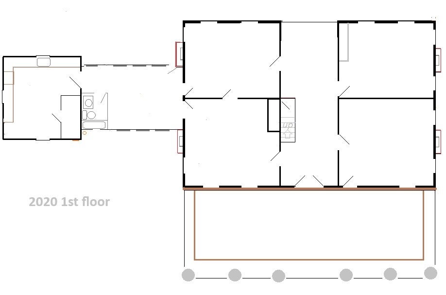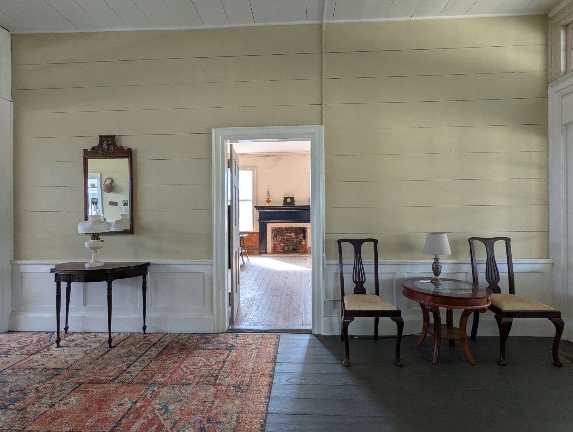 Before its purchase in 2020, the original section of the home had never been updated to include modern amenities such as a kitchen, bathroom, or any form of indoor plumbing; the nineteenth-century dwelling featured only electricity. In the 1920s, a north-facing side structure, believed to have been a covered porch, was replaced with a one-story detached kitchen and connecting open breezeway. In the 1950s, indoor plumbing was introduced into the detached kitchen along with modern appliances, and an indoor bathroom was installed in the breezeway.