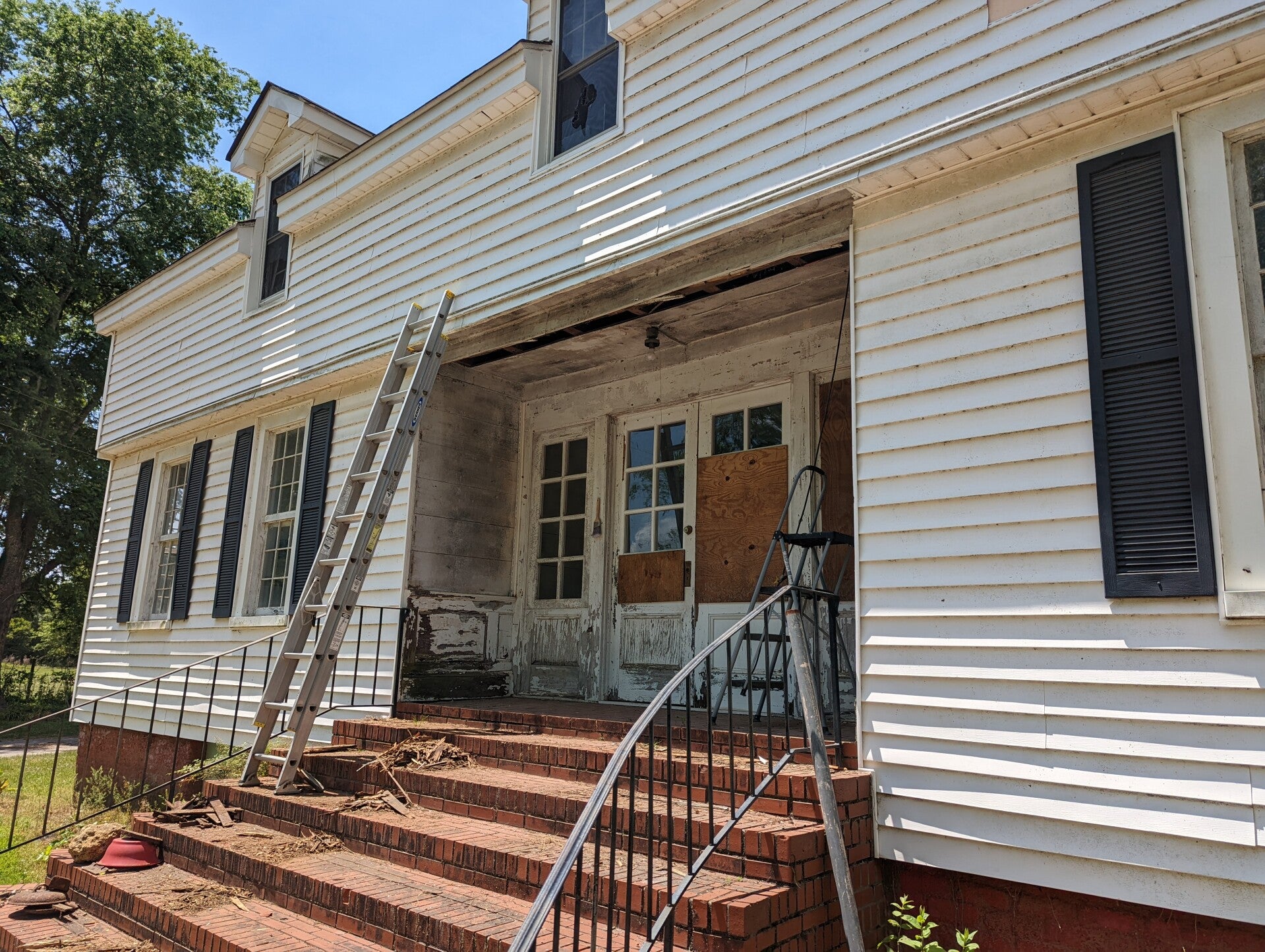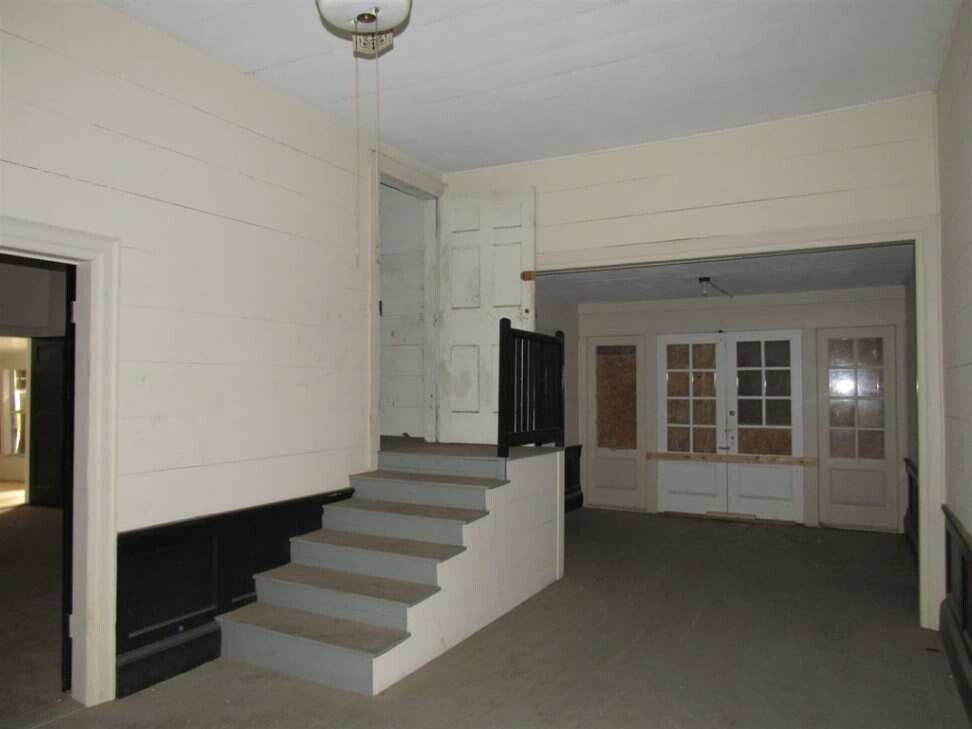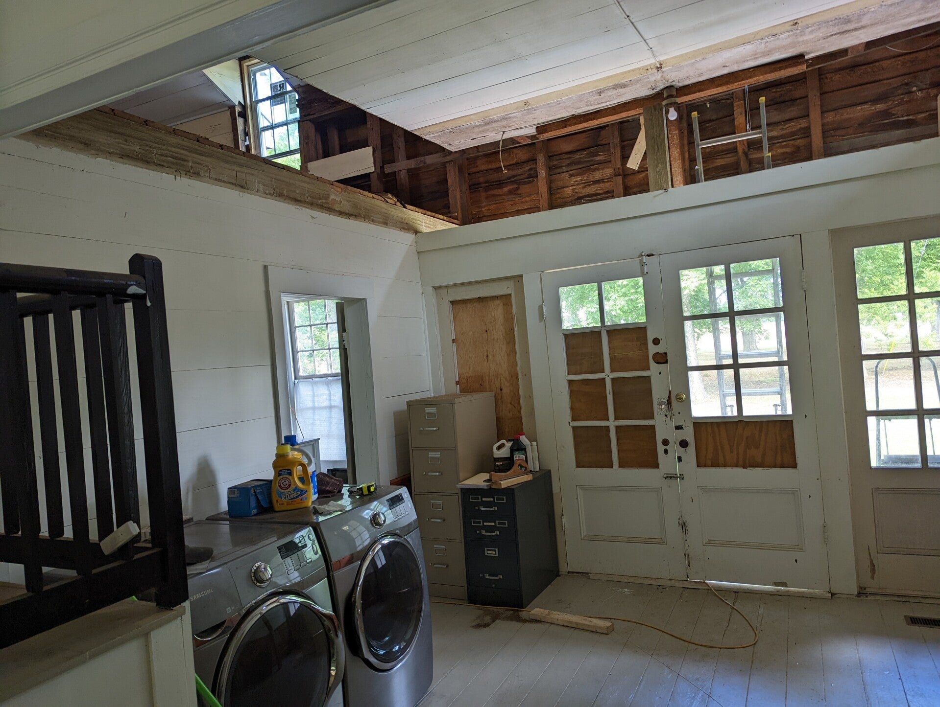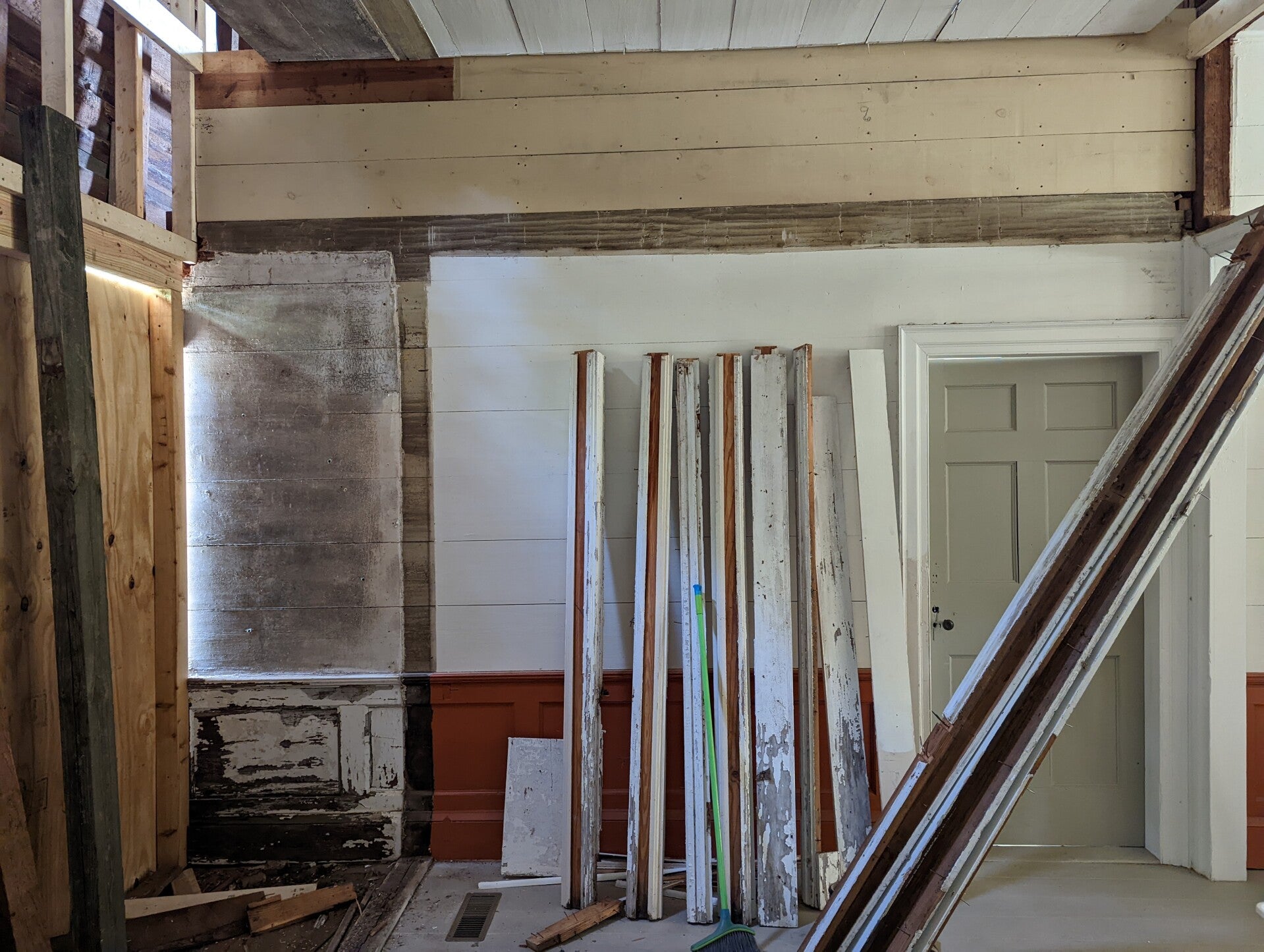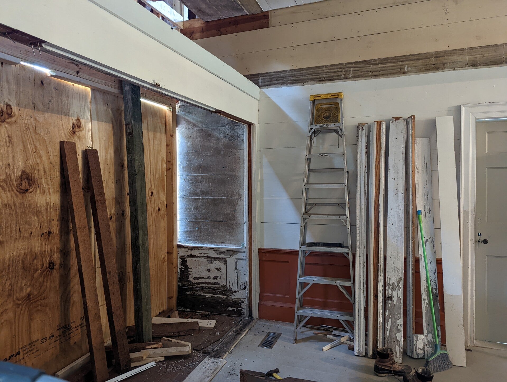 The rear hallway ceiling has been restored to its proper height, and the center transom has been moved back to its original position. A temporary liftable wall has been installed in place of the damaged rear double-door enclosure.