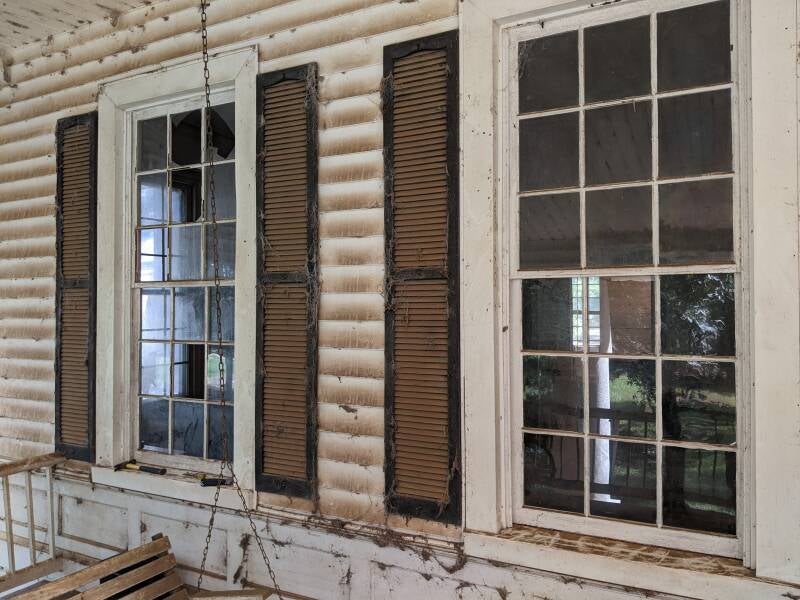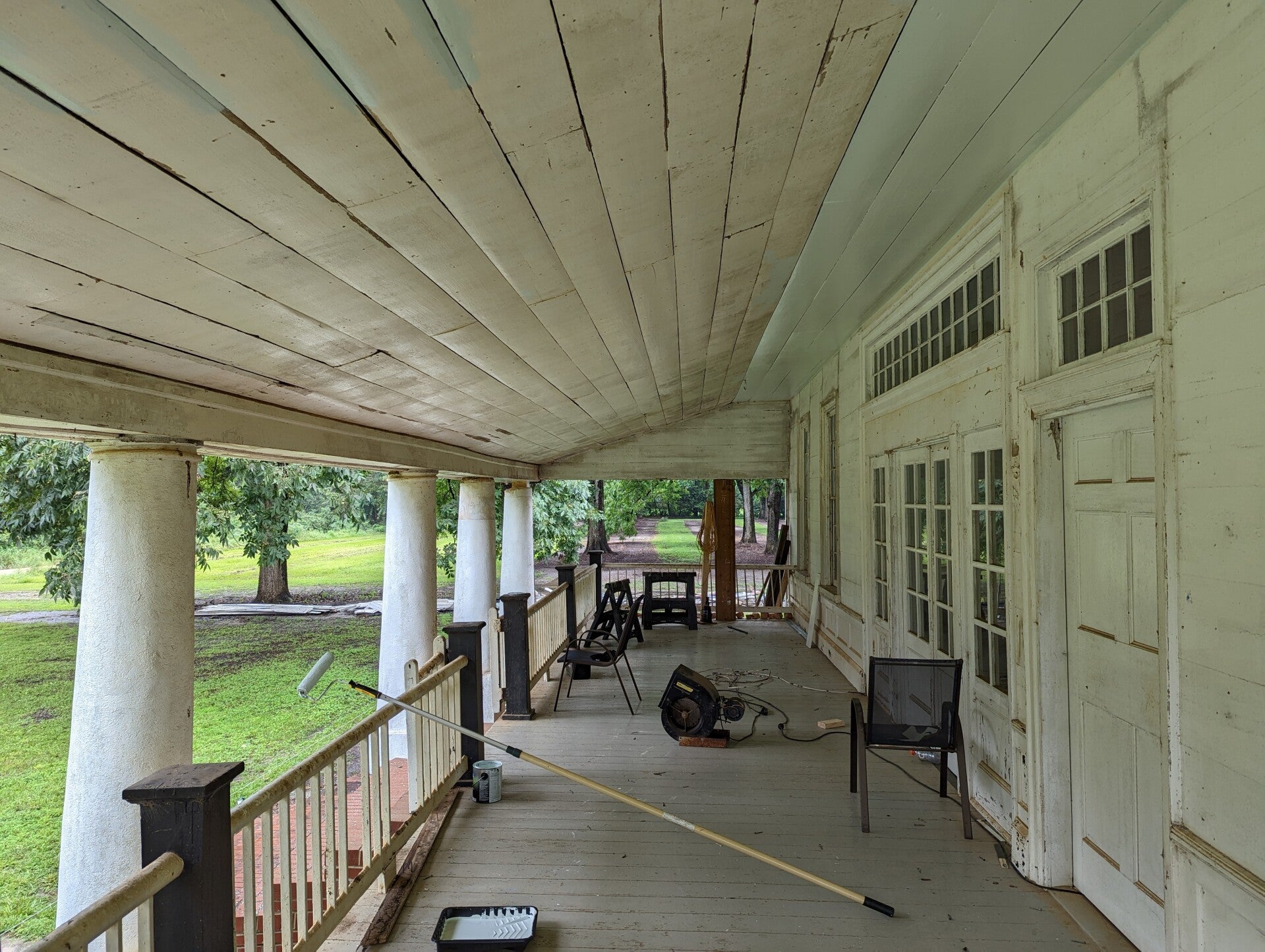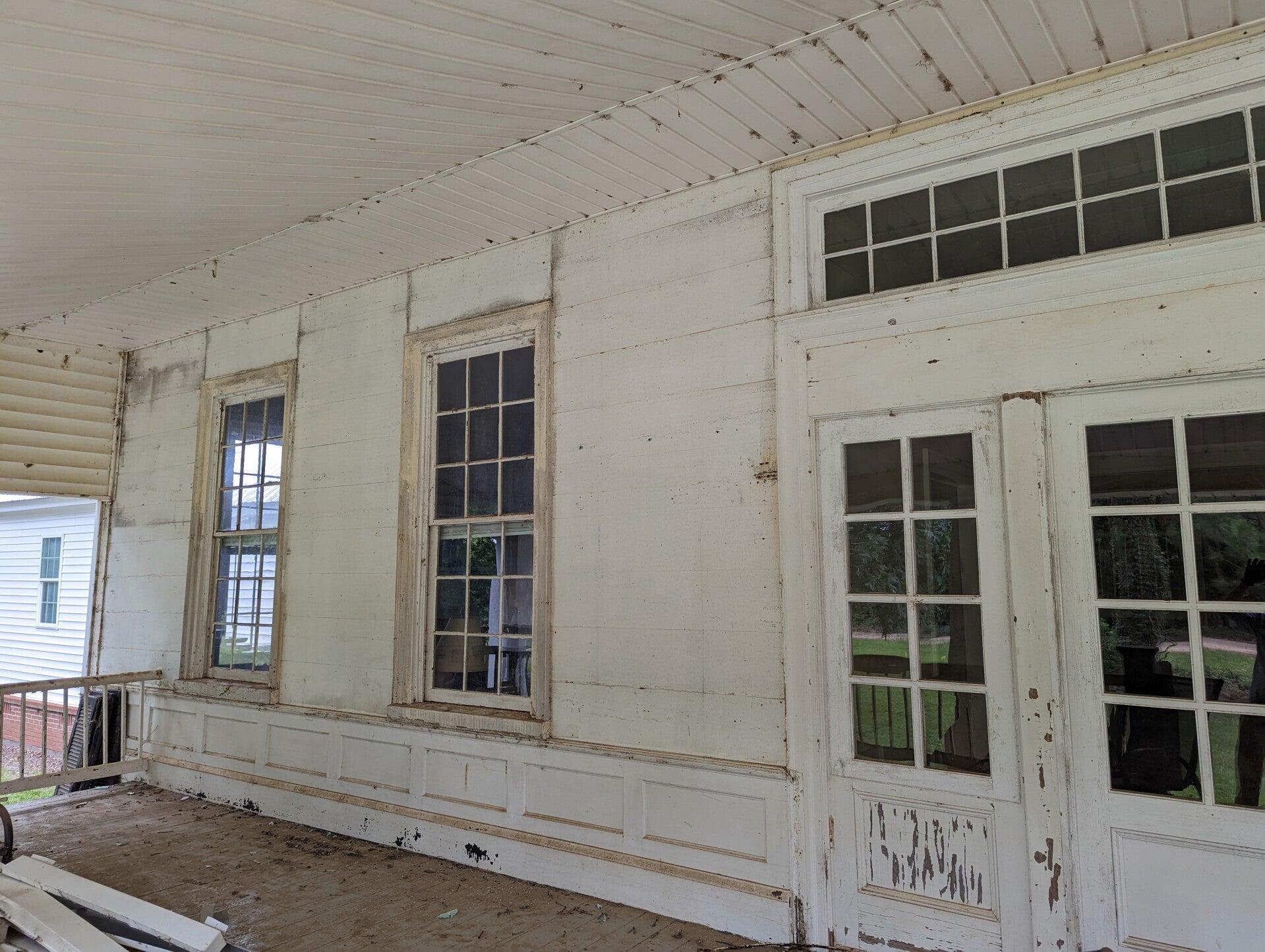 The porch was in surprisingly good condition, needing only a few repairs. Some pickets had been kicked out by vandals, and a few fascia boards required replacement. The vinyl siding was removed from the smooth-board walls and ceiling, which were then scraped and painted.