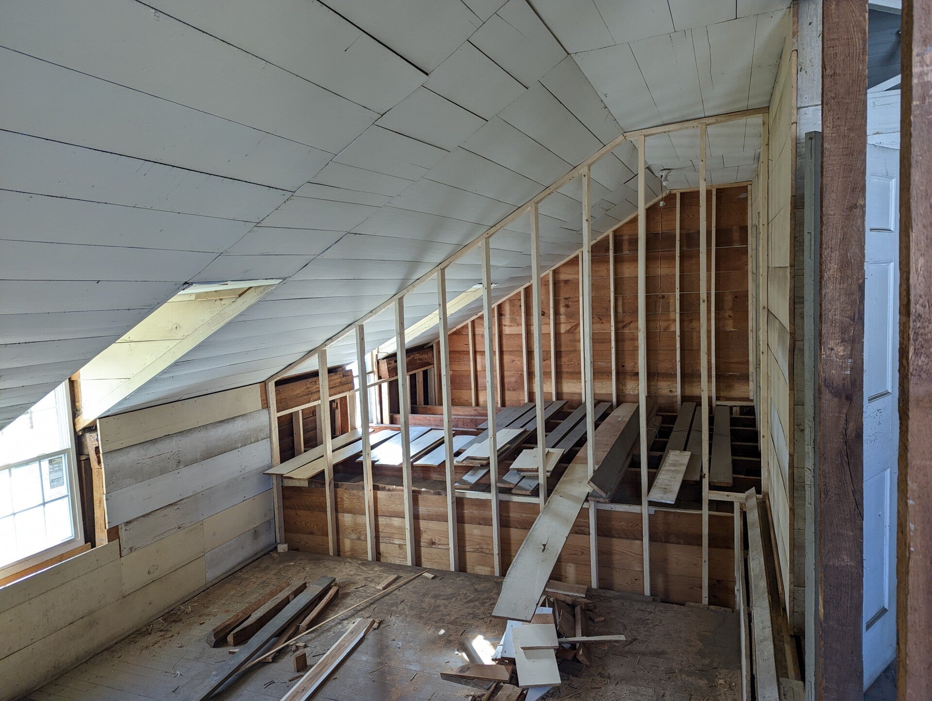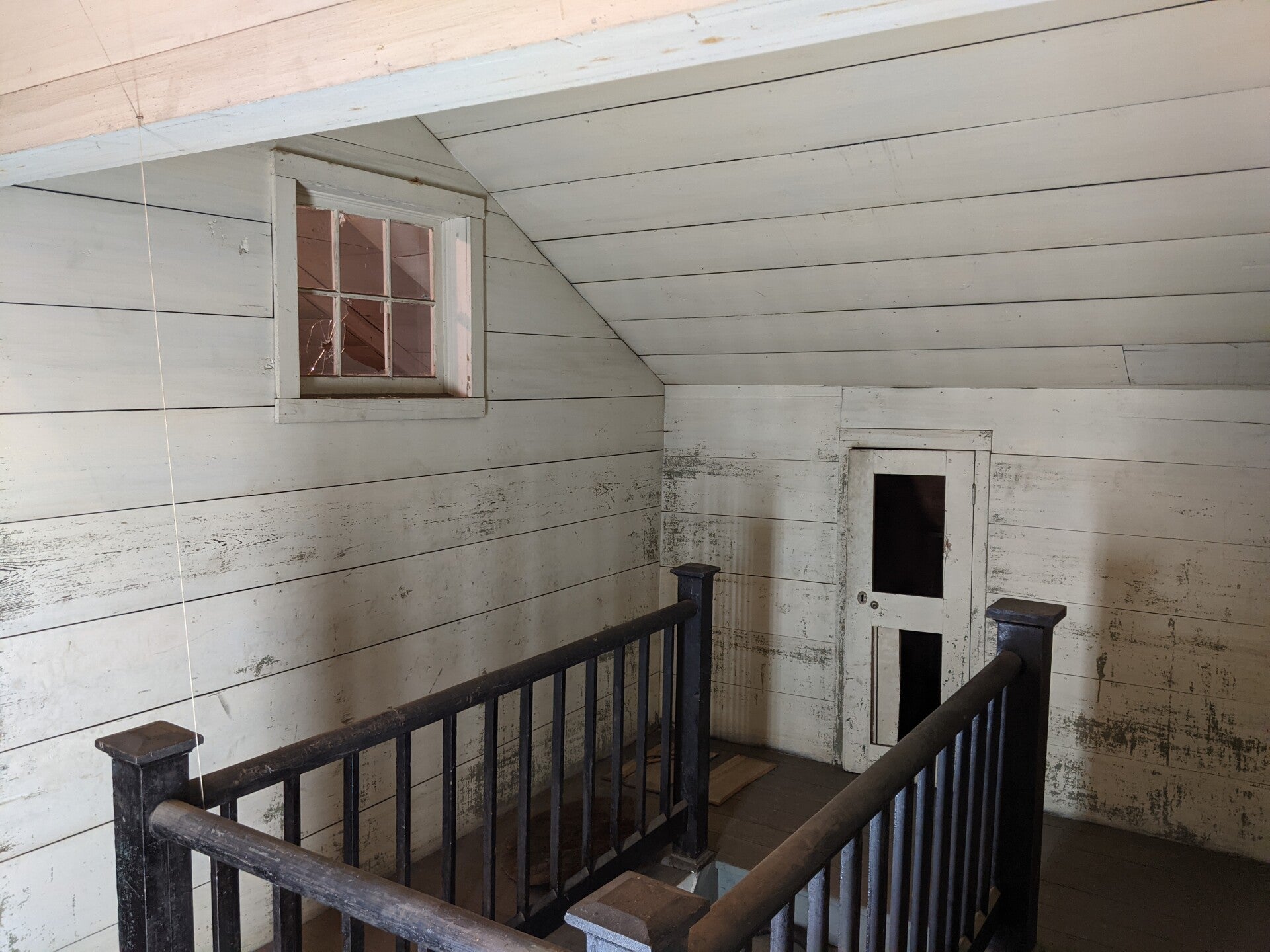 The upstairs has undergone limited work so far, but further improvements are planned for the future. Modifications made around 1915 altered the rear half of the upstairs, creating one large room that spanned the entire width of the house. When the first-floor hallway was restored, the middle section of this room was raised back to the correct height. Additionally, some partition walls and bracing have been installed.